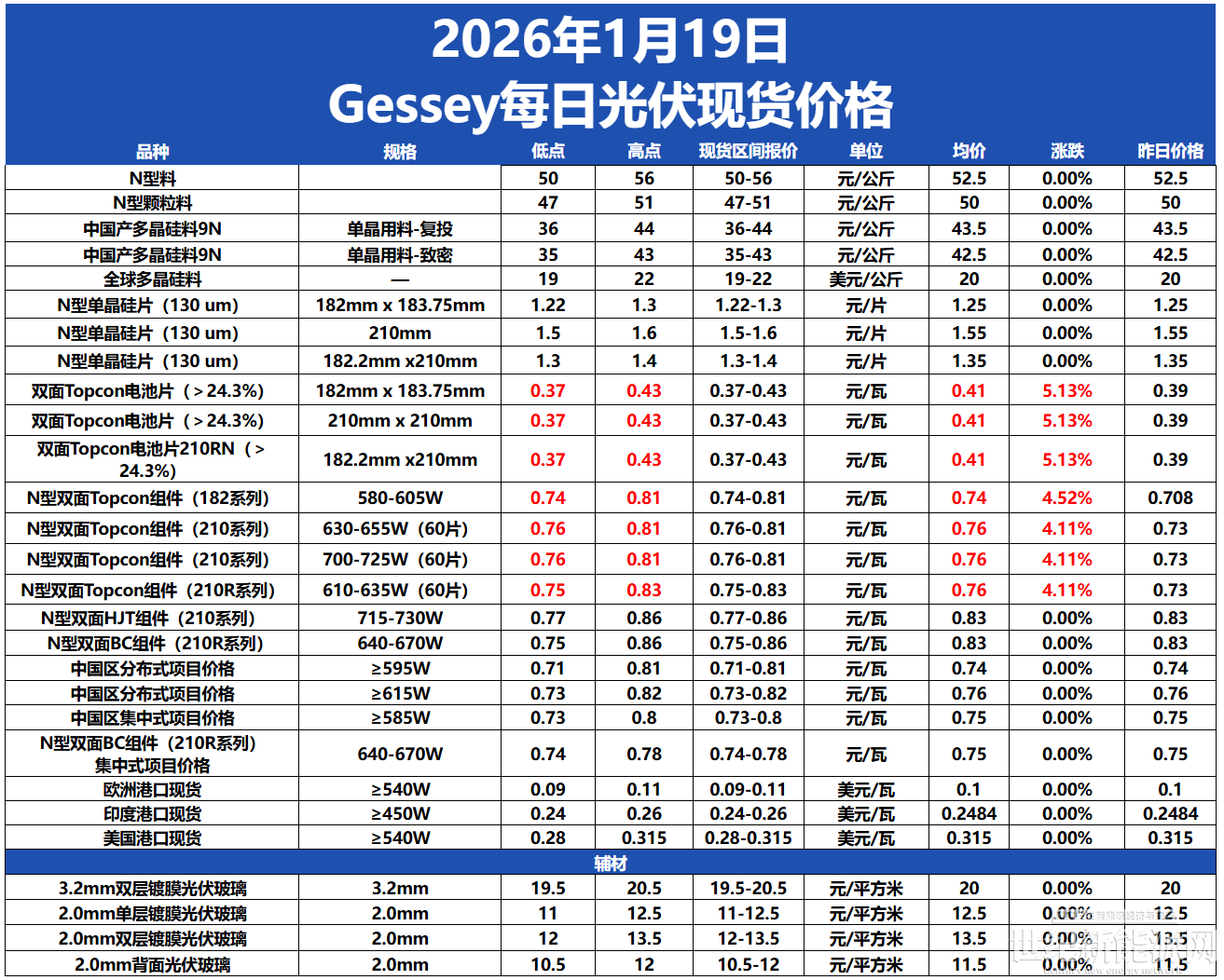 电池片方面,受白银价格持续飙升影响,电池片生产成本显著增加。由于利润被挤压,企业为维持盈利空间,选择调高价格。24.3%以上183.75mm、210mm及210Rmm双面Topcon电池片主流价格均来到0.37-0.43元/瓦,均价达0.41元/瓦,较之前上涨5.13%。周初,各电池片企业便因成本因素低价惜售,随着成本压力持续加大,最新的高位报价已调高到0.43元/瓦。