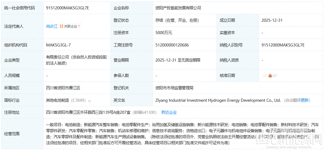 企查查显示,2025-12-31,资阳产投氢能发展有限公司成立,注册资本5000万元,法定代表人肖庆江。