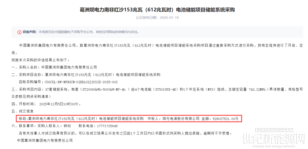1月19日,葛洲坝电力南非红沙153兆瓦(612兆瓦时)电池储能项目储能系统采购中标结果发布。