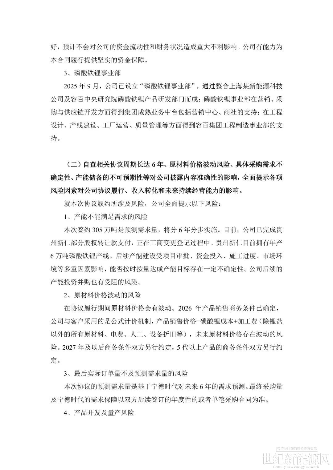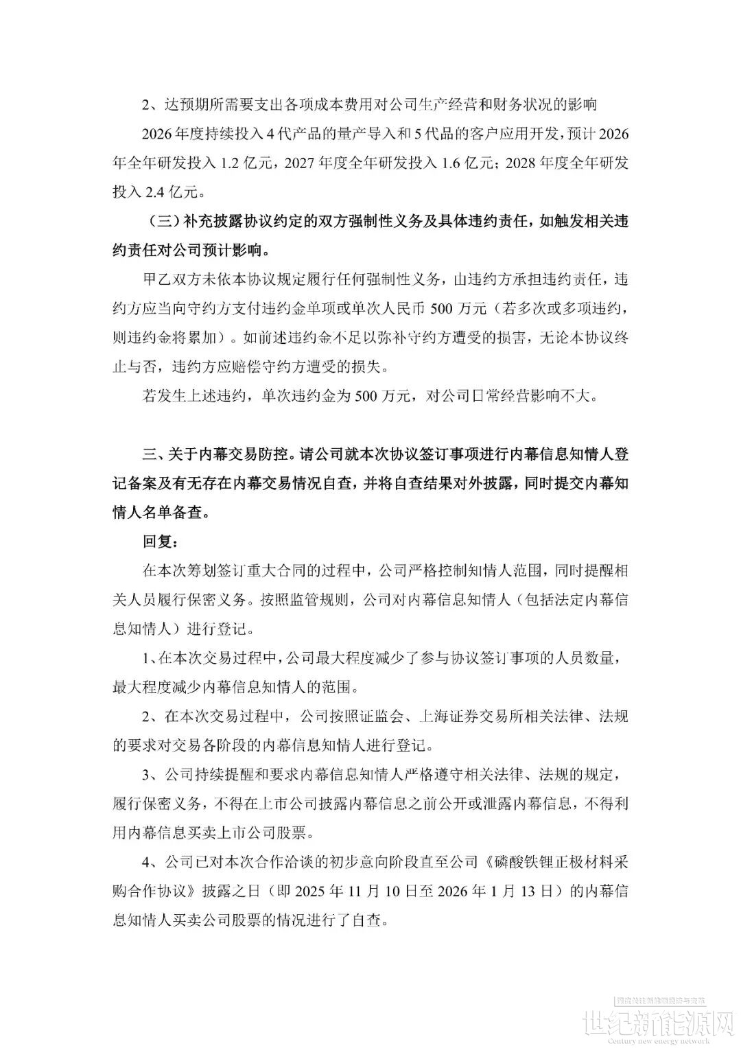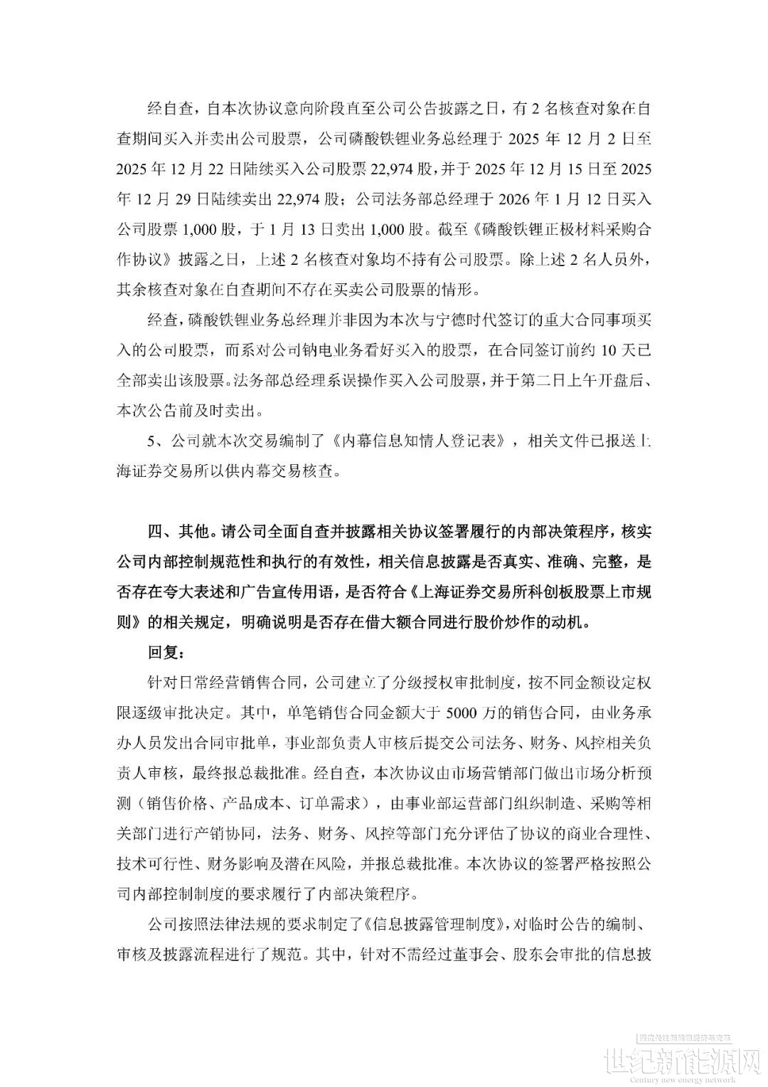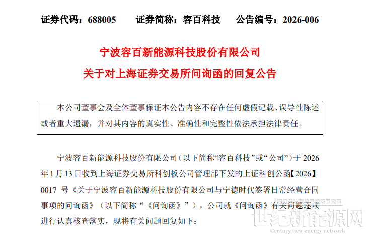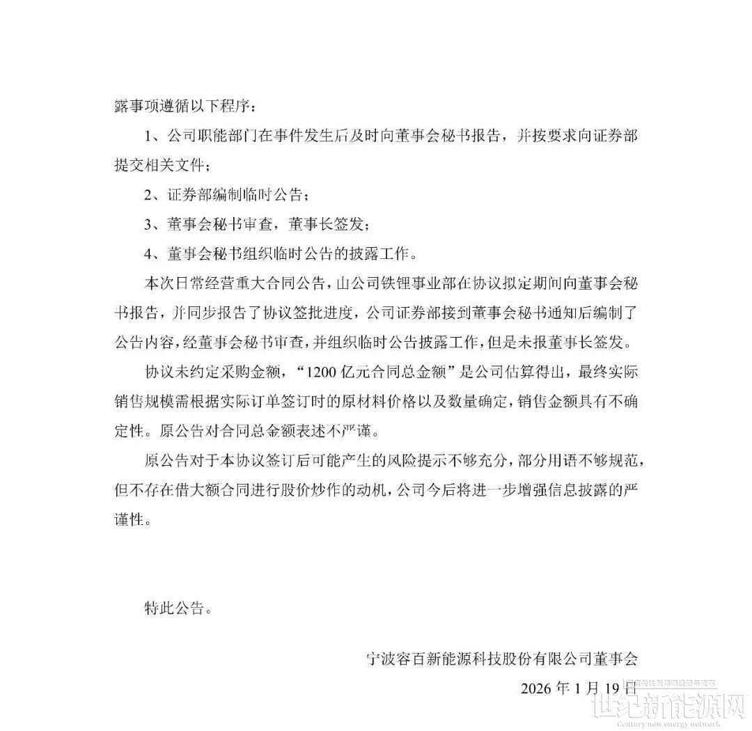 回顾事件发生过程。1月14日,容百科技公告披露,自2026年第一季度开始至2031年,将为宁德时代供应国内区域磷酸铁锂正极材料预计为305万吨,协议总销售金额超1200亿元。公告当日,上交所火速下发问询函,要求公司就信息披露准确性、协议具体内容、内幕信息管控等方面进行补充说明。