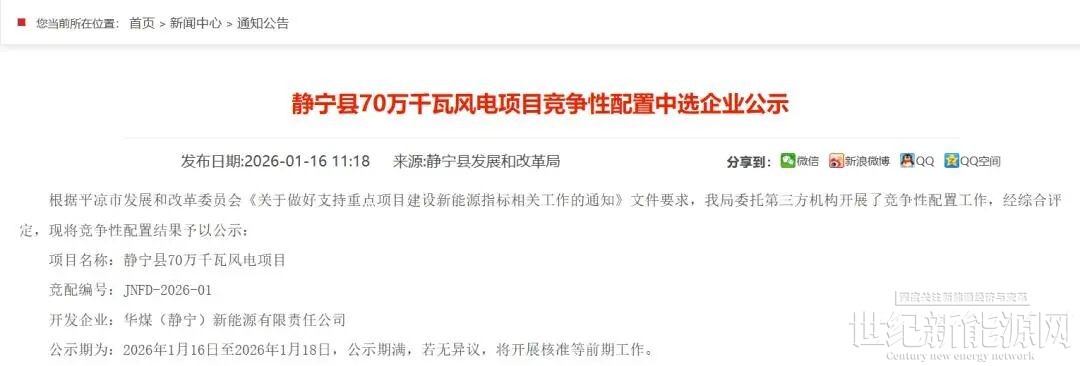 1月16日,甘肃静宁县人民政府发布《静宁县70万千瓦风电项目竞争性配置中选企业公示》。