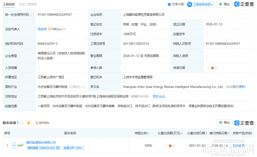 近日,上饶晶科能源伍号智造有限公司成立,注册资本1,000万元,法定代表人为陈经纬,由晶科能源全资持股。