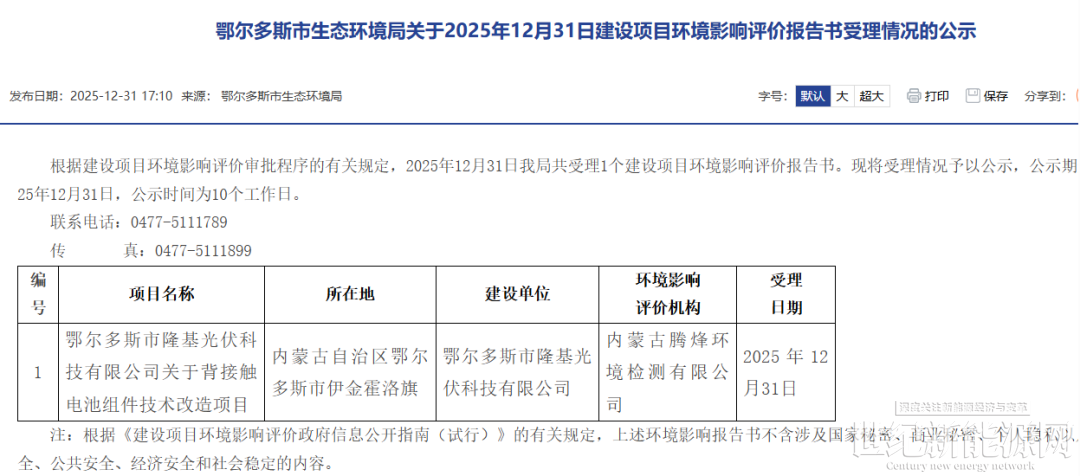 近日,鄂尔多斯市生态环境局发布鄂尔多斯市隆基光伏科技有限公司关于背接触电池组件技术改造项目环境影响评价报告书受理情况的公示。