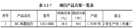 目前已建成6条TOPCon 组件生产线(钝化接触电池的组件)(产能约为5GW),为满足内蒙古市场多元化需求,建设单位计划其中的2条钝化接触电池的组件生产线进行技术改造,通过新增丝网印刷工艺设备同时采用背接触电池的组件生产线工艺流程设置生产线(即BC组件生产线,产能为1.7GW),使生产线具备背接触电池组件的生产能力。项目建成后全厂年产能不变,仍为5GW单晶组件(TOPCon 生产线产能为3.3GW,BC组件生产线产能为1.7GW)。