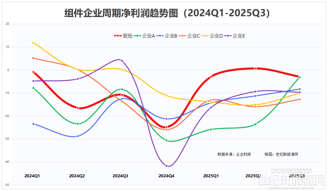 世纪新能源网对6家上市组件头部企业的2024Q1-2025Q3净利润数据进行搜集整理,可以看出爱旭自2024年Q4起,开始“触底”反弹,2025年Q2,更是以6286.49万的净利润“回正”,成为2024Q4以来,头部组件企业中唯一一家净利润为正数的企业。