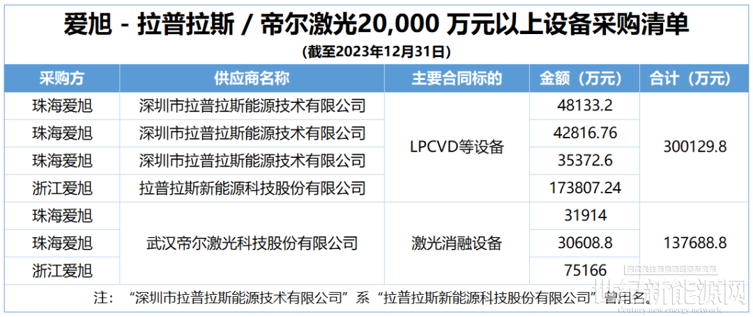 据北京国枫律师事务所出具爱旭定增补充意见书披露,截至2023年12月31日,爱旭20,000万元以上的重大设备采购合同、订单数据显示,帝尔激光进账13.77亿元,拉普拉斯进账30.01亿元。