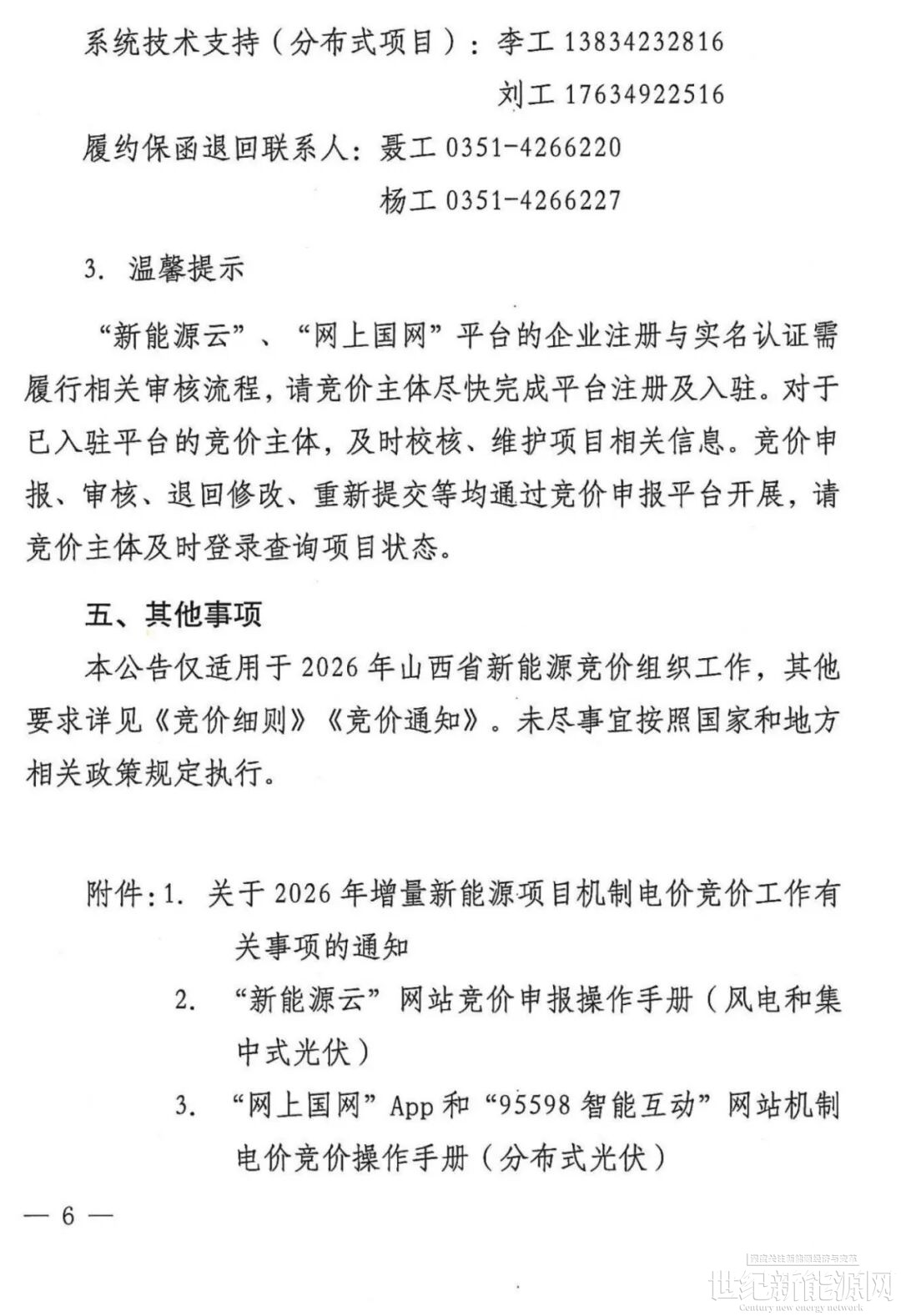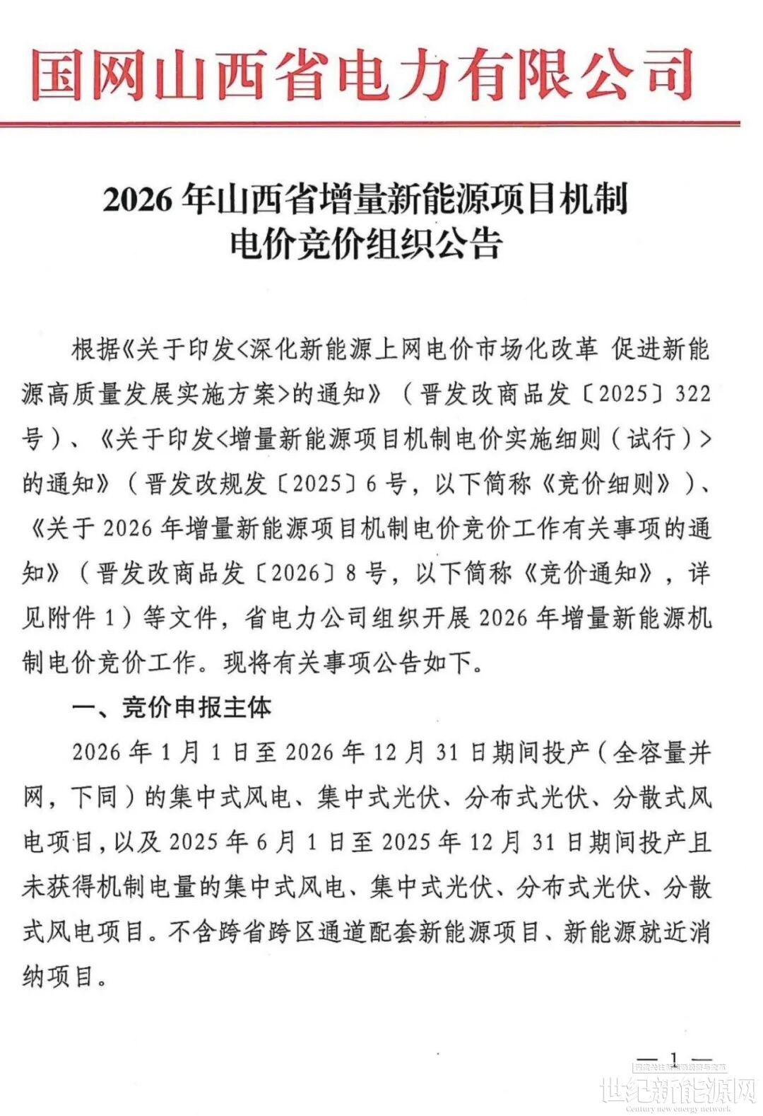 1月16日,国网山西省电力有限公司发布2026年山西省增量新能源项目机制电价竞价组织公告。