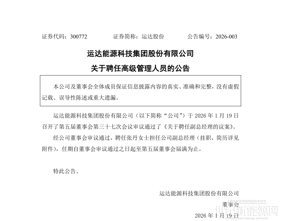 1月19日,运达股份发布《关于聘任高级管理人员的公告》。公告披露,运达股份于2026年1月19日召开了第五届董事会第三十七次会议审议通过了《关于聘任副总经理的议案》。经公司董事会审议通过,聘任张丹女士担任公司副总经理(挂职),任期自董事会审议通过之日起至第五届董事会届满为止。