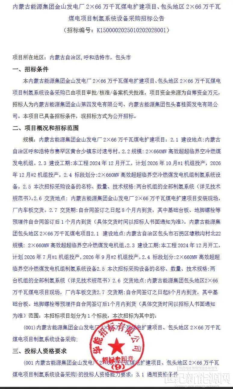 1月20日,内蒙古能源集团金山发电厂2×66万千瓦煤电扩建项目、包头地区2×66万千瓦煤电项目制氢系统设备采购招标公告。
