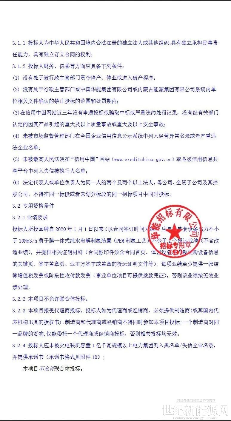 要求投标人所投品牌自2020年1月1日以来(以合同签订时间为应于10Nm³/h质子膜一体式纯水电解制氢装置(PEM制氢工艺)不少于一个投运业绩(不含改招标专用章造业绩)。