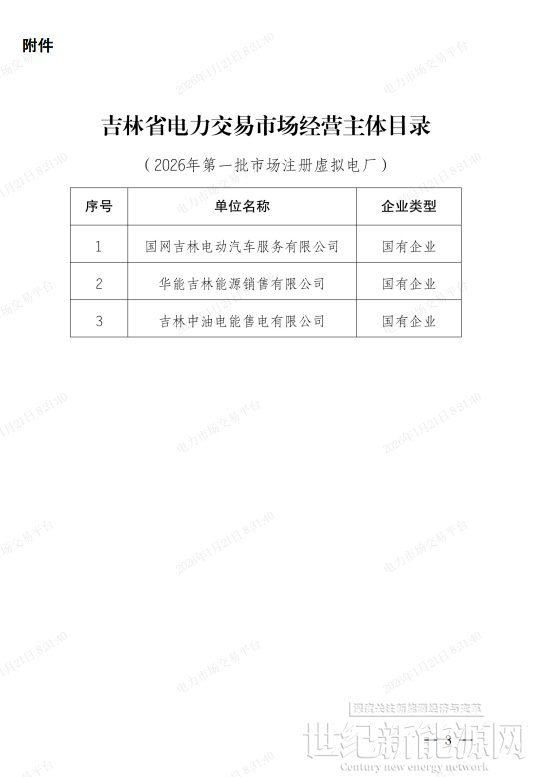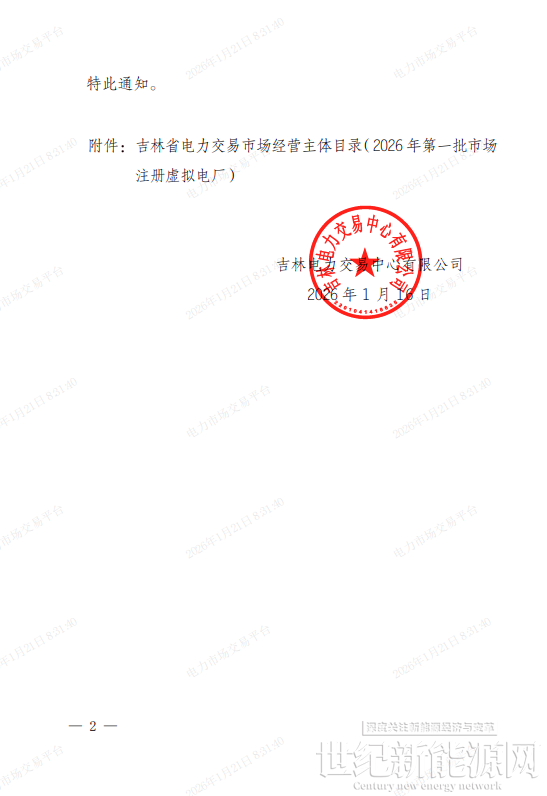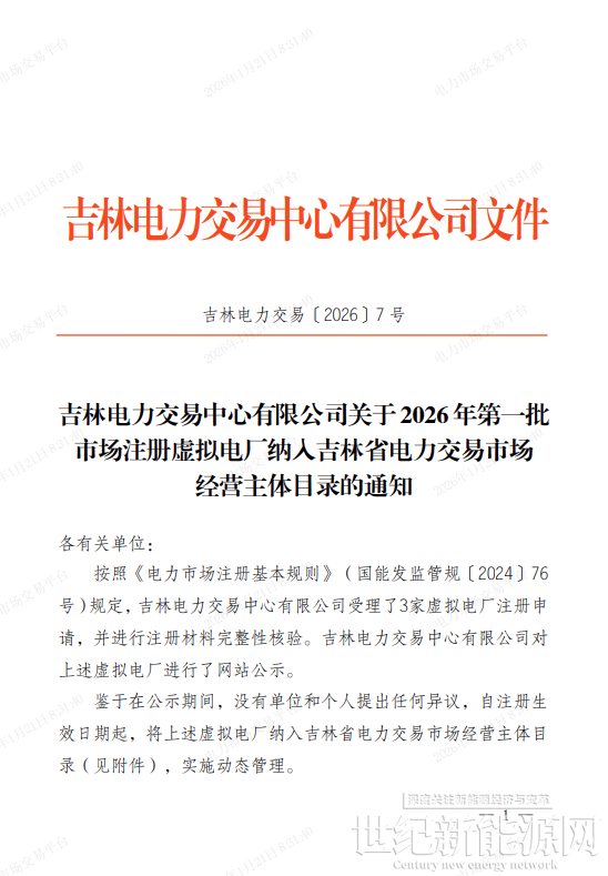 2026年1月20日,吉林电力交易中心发布关于2026年第一批市场注册虚拟电厂纳入吉林省电力交易市场经营主体目录的通知。