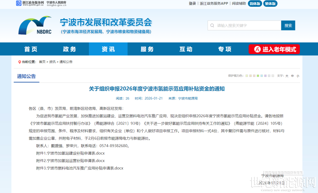 氢能观察从宁波市发改委获悉,2026年1月21日,宁波市能源局印发“关于组织申报2026年度宁波市氢能示范应用补贴资金的通知”。
