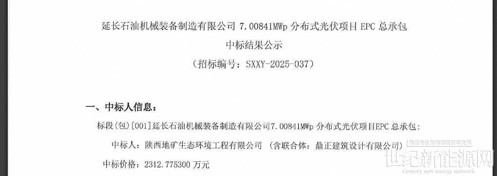 近日,延长石油机械装备制造有限公司7.00841MWp分布式光伏项目EPC总承包中标结果公示。