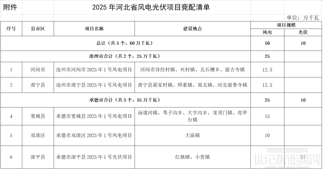 1月19日,河北省发改委发布《关于部分项目补充纳入2025年河北省风电光伏项目竞配清单的通知》,增补5个项目纳入2025年度风电光伏项目竞配清单,总规模为60万千瓦。