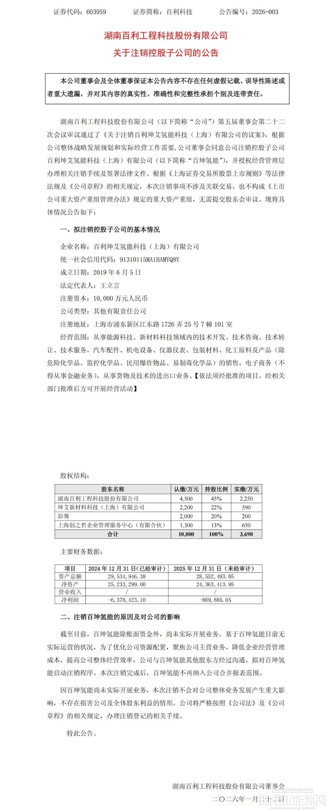 对于注销百坤氢能的原因及对公司的影响, 百利科技表示,截至目前,百坤氢能除账面资金外,尚未实际开展业务。基于百坤氢能目前无实际运营的状况,为了优化公司资源配置,聚焦公司主营业务,降低企业经营管理成本,提高公司整体经营效率,公司与百坤氢能其他股东方经过沟通,拟对百坤氢能启动注销程序。本次注销完成后,百坤氢能不再纳入公司合并报表范围。