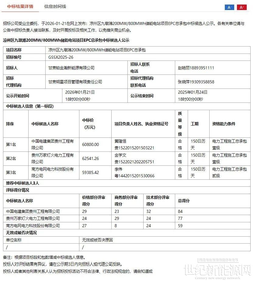 1月21日,凉州区九墩滩200MW/800MWh储能电站项目EPC总承包中标候选人公示。