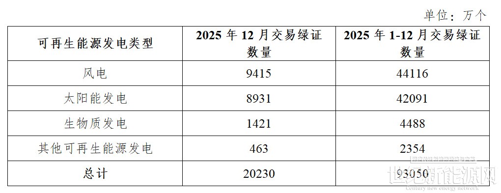 2025年12月,风电交易绿证9415万个,1-12月风电交易绿证44116万个。