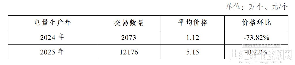 2025年12月,电量生产年为2024年的绿证交易平均价格1.12元/个,电量生产年为2025年的绿证交易平均价格5.15元/个。