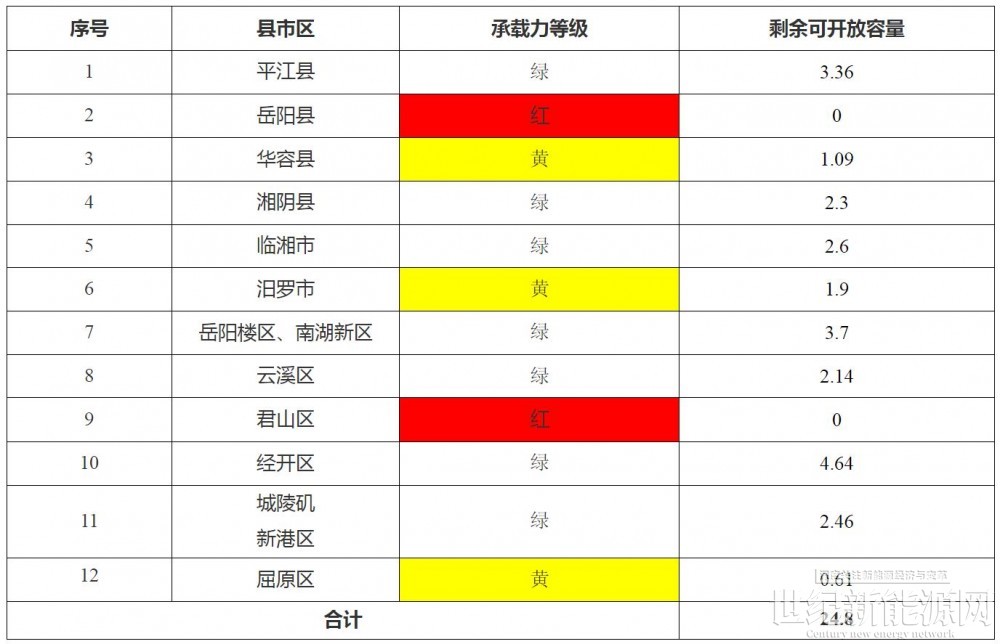 根据计算原则,国网湖南电力经营区岳阳地区各县市区分布式光伏接入可开放容量为24.8万千瓦。