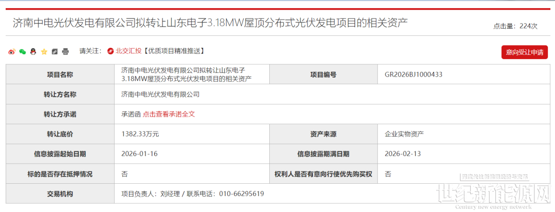 日前,济南中电光伏发电有限公司拟转让山东电子3.18MW屋顶分布式光伏发电项目的相关资产,转让底价1382.33万元,转让方为济南中电光伏发电有限公司,批准单位为中国电力国际发展有限公司。