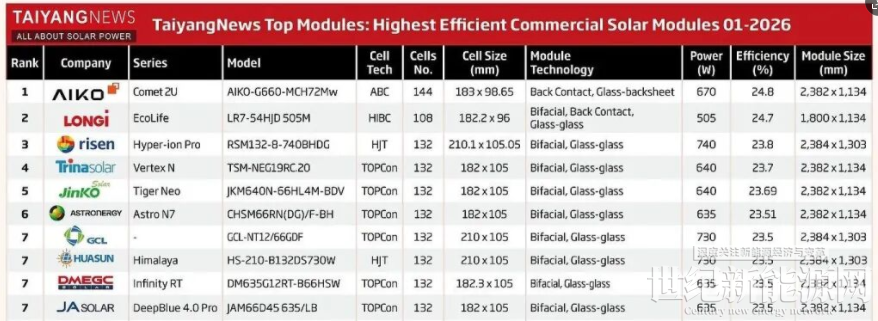 目前,通威、晶科、晶澳、天合、隆基、爱旭、东方日升、华晟几大组件企业手中各有高效组件王牌,在转换率的赛道上近乎贴身肉搏。根据Taiyangnews1月最新光伏组件转换率榜单显示,BC继续霸榜,HJT实现逆袭,TOPCon仍在追赶。