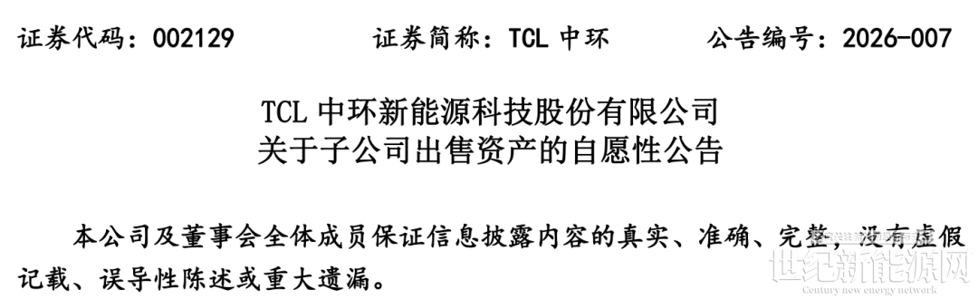 1月24日,TCL中环发布关于子公司出售资产的自愿性公告。