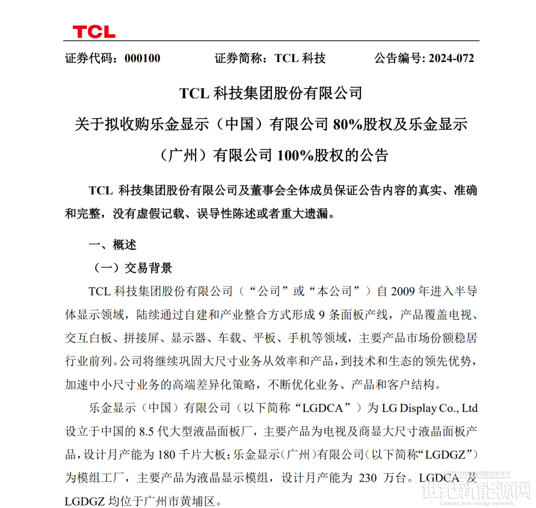 2024年10月,TCL华星确认拟以108亿元总价收购LG显示位于广州的8.5代液晶面板产线(主要产品为电视及商用显示大尺寸液晶面板)以及一个模组工厂。4月,LGD(乐金显示)广州工厂完成交割,这次交易协议约定的最终收购金额为110.88亿元。