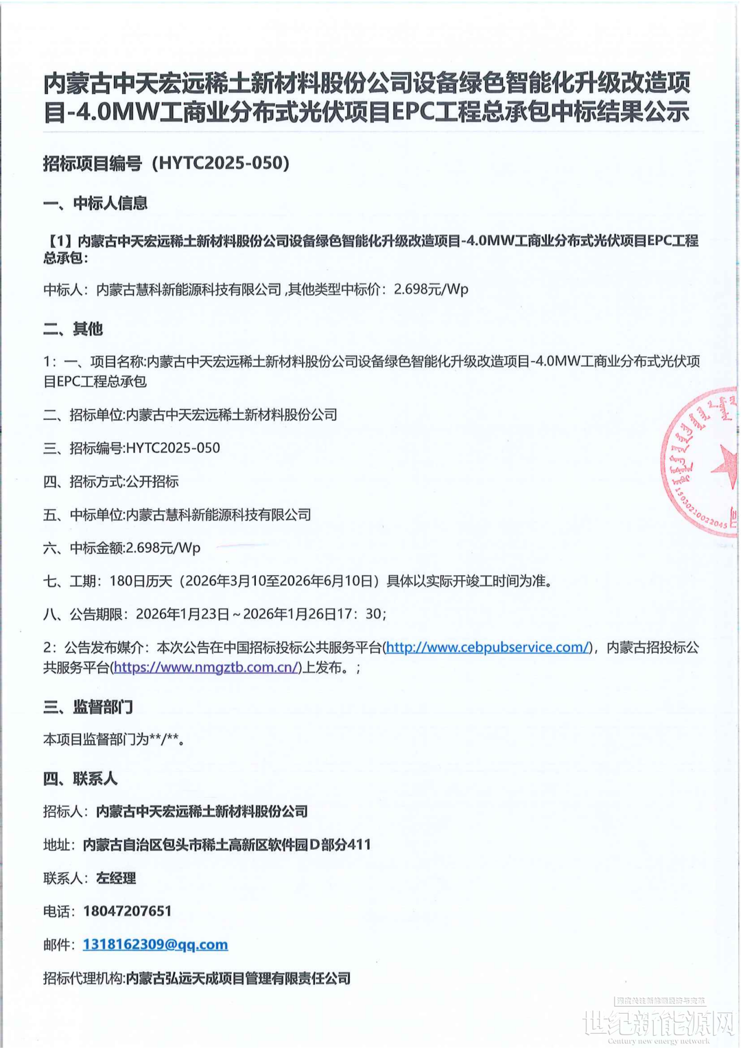 1月23日,内蒙古中天宏远稀土新材料股份公司设备绿色智能化升级改造项目—4.0MW工商业分布式光伏项目EPC工程总承包中标结果公示,中标人为内蒙古慧科新能源科技有限公司,中标价2.698元/W。