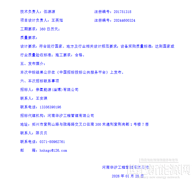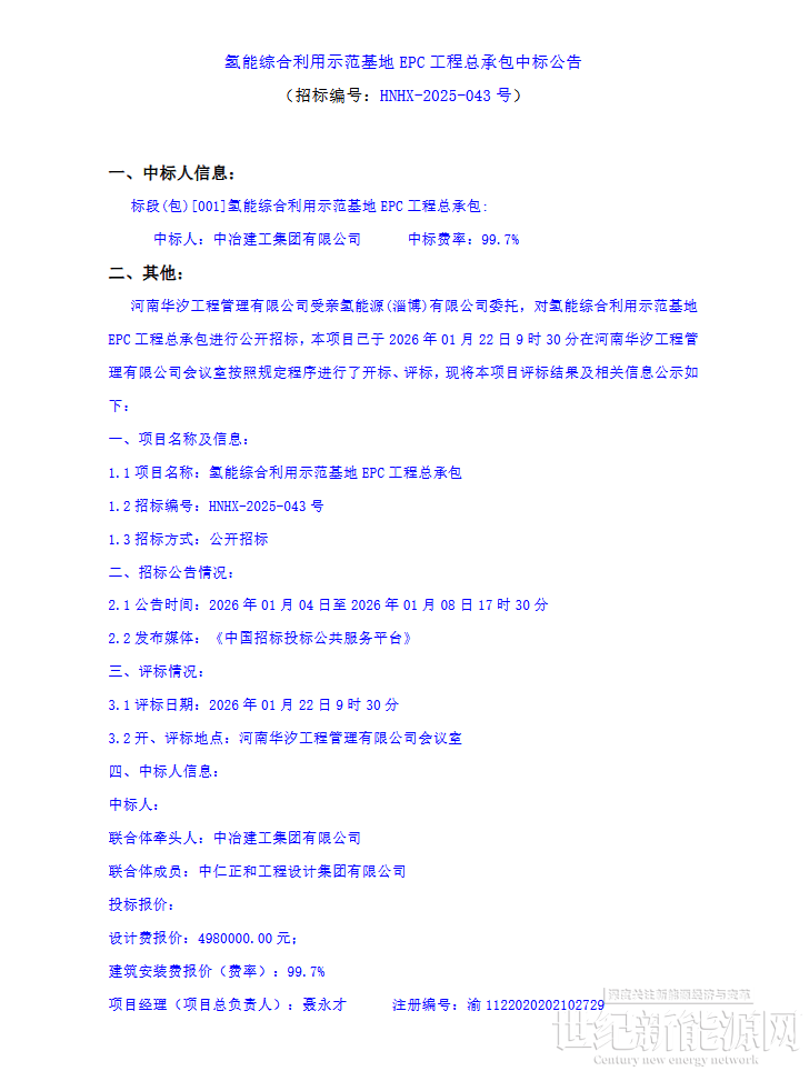 1月26日,亲氢能源氢能综合利用示范基地EPC工程总承包中标公告发布。