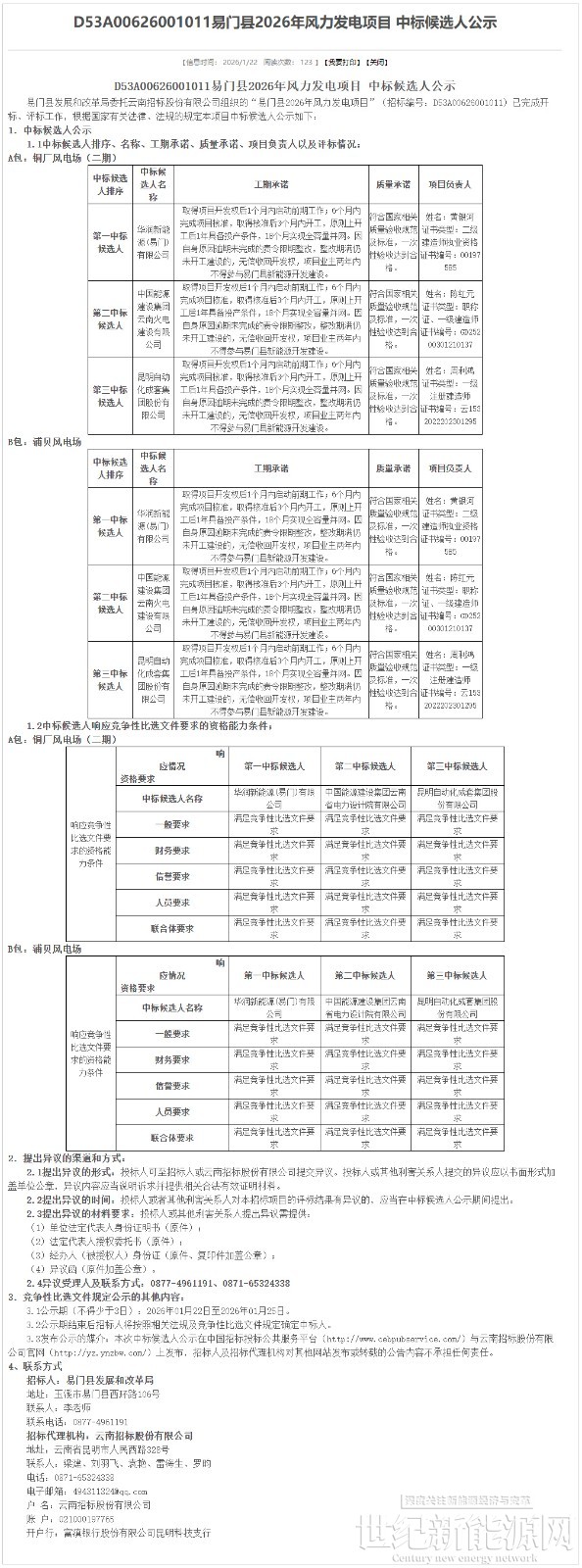 1月22日,云南省易门县发布2026年风力发电项目中标候选人公示。