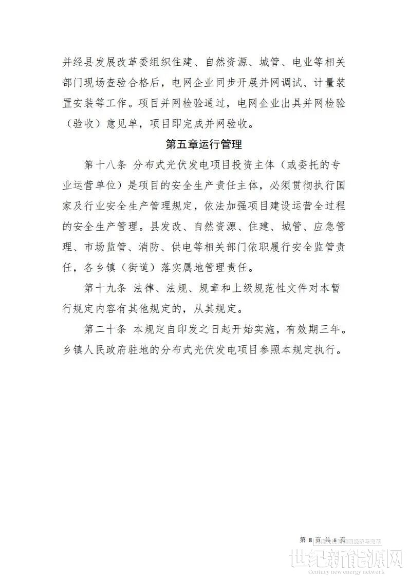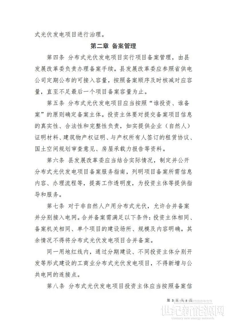 文件指出,分布式光伏发电项目实行项目备案管理,由县发展改革委负责办理备案手续。县发展改革委应参照省供电公司定期公布的可接入容量,按照备案顺序及时核减对应容量,直至不足最后一个项目备案容量为止。