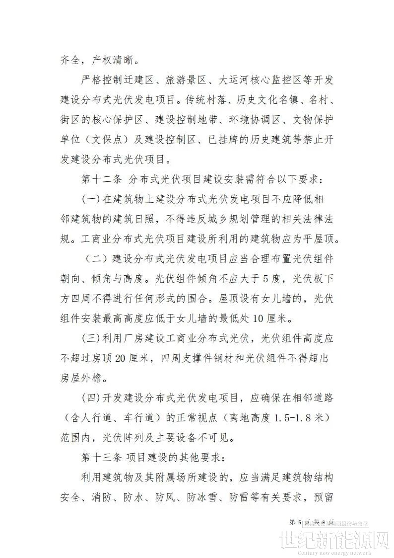 文件明确,严格控制迁建区、旅游景区、大运河核心监控区等开发建设分布式光伏发电项目。传统村落、历史文化名镇、名村、街区的核心保护区、建设控制地带、环境协调区、文物保护单位(文保点)及建设控制区、已挂牌的历史建筑等禁止开发建设分布式光伏项目。