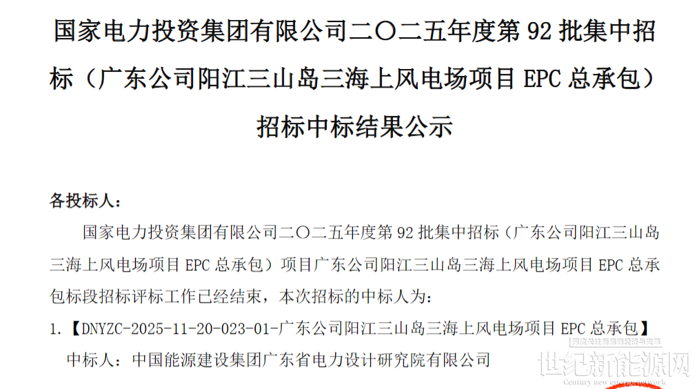 1月26日,国家电投电子商务平台发布《国家电力投资集团有限公司二〇二五年度第 92 批集中招标(广东公司阳江三山岛三海上风电场项目 EPC 总承包)招标中标结果公示》的公告。