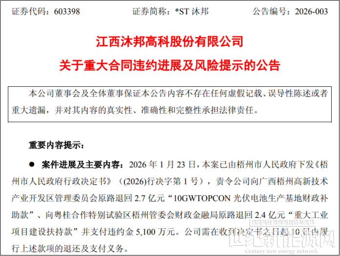 1月26日,江西沐邦高科股份有限公司(简称*ST沐邦,SH:603398)发布公告称,梧州市人民政府下发《梧州市人民政府行政决定书》,责令公司向广西梧州高新技术产业开发区管理委员会原路退回2.7亿元“10GW TOPCON光伏电池生产基地财政补助款”、向粤桂合作特别试验区梧州管委会财政金融局原路退回2.4亿元“重大工业项目建设扶持款”并支付违约金5,100万元。公司需在收到决定书之日起10日内履行上述款项的退还及支付义务。
