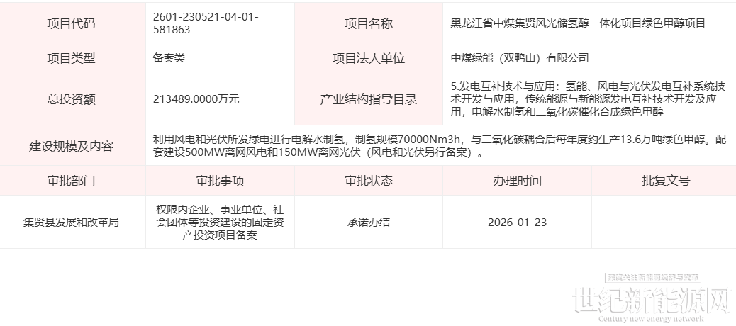 1月23日,黑龙江省投资项目在线审批监管平台发布信息显示,黑龙江省中煤集贤风光储氢醇一体化项目绿色甲醇项目通过备案。