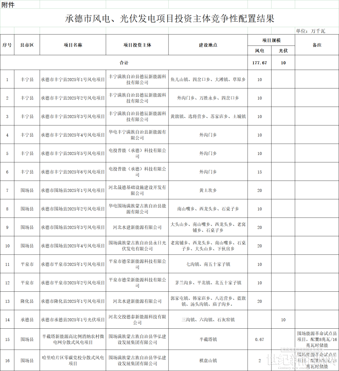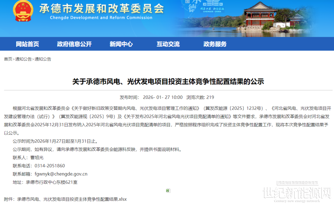 1月27日,河北省承德市发改委发布《关于承德市风电、光伏发电项目投资主体竞争性配置结果的公示》。根据公示,此次共披露16个风光项目,规模合计187.67万千瓦。其中,风电项目15个,规模合计177.67万千瓦,光伏项目1个,规模合计10万千瓦。