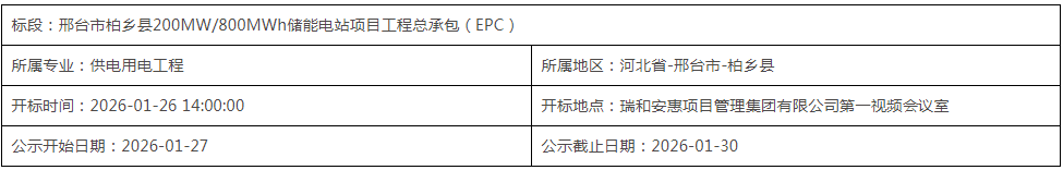 1月27日,邢台市柏乡县200MW/800MWh储能电站项目工程总承包(EPC)中标候选人公示。