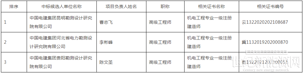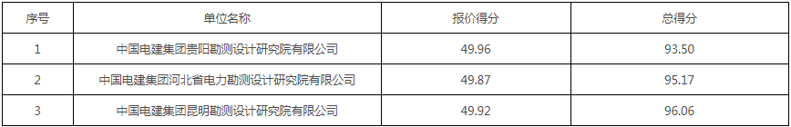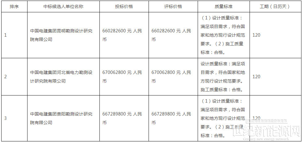 第一中标候选人:中国电建集团昆明勘测设计研究院有限公司,投标报价为66028.26万元,折合单价0.8254元/Wh;