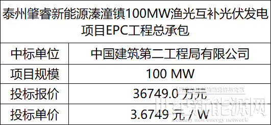 1月28日,泰州肇睿新能源溱潼镇100MW渔光互补光伏发电项目EPC工程总承包中标结果公示,中标企业为中国建筑第二工程局有限公司。投标报价金额:36749.0万元。