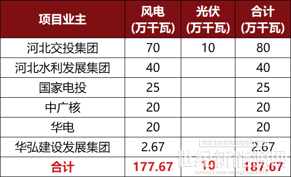 河北交投集团、河北水利发展集团、国家电投、中广核、华电、华弘建设发展集团获得此次16个风光项目指标,共计187.67万千瓦。