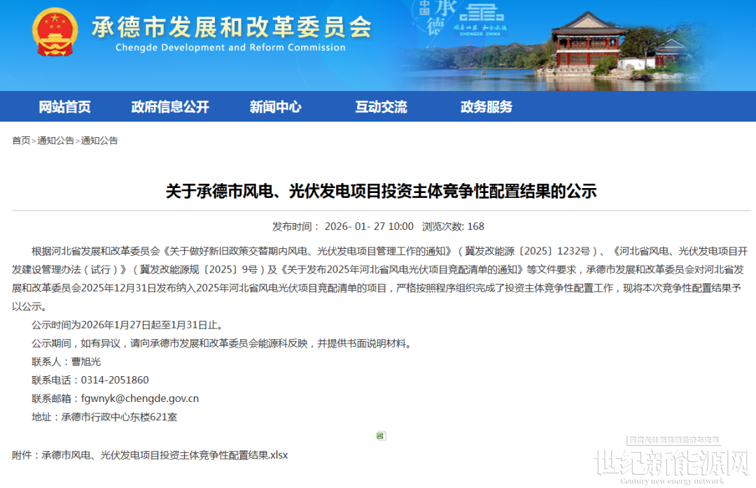 1月27日,河北省承德市发展和改革委员会公示承德市风电、光伏发电项目投资主体竞争性配置结果。