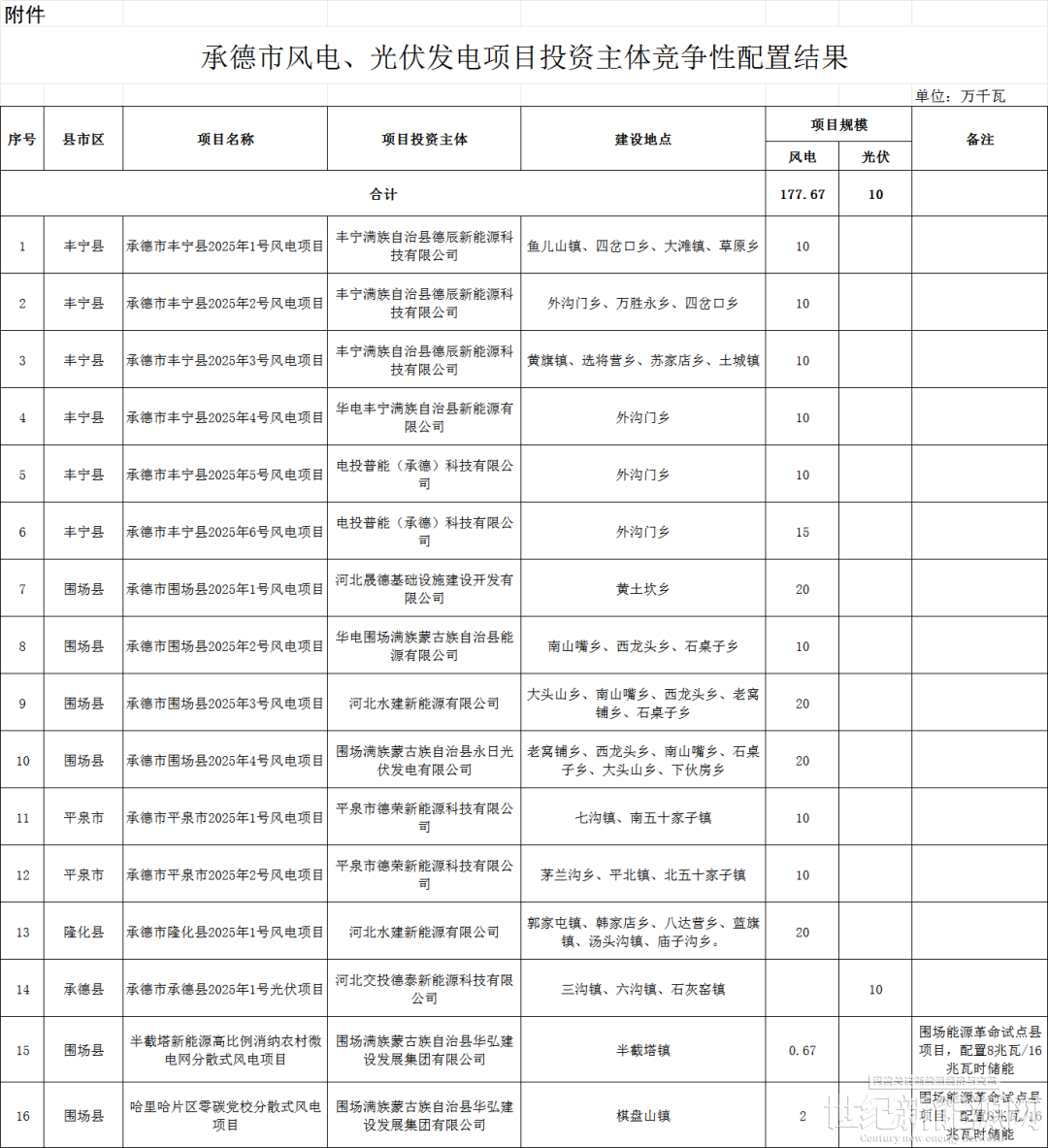 公告显示,本次竞配,承德县、丰宁县、平泉市、隆化县、围场县风电和光伏发电项目共16个,规模共计187.67万千瓦。其中风电项目15个,规模合计177.67万千瓦;光伏项目1个,规模合计10万千瓦。