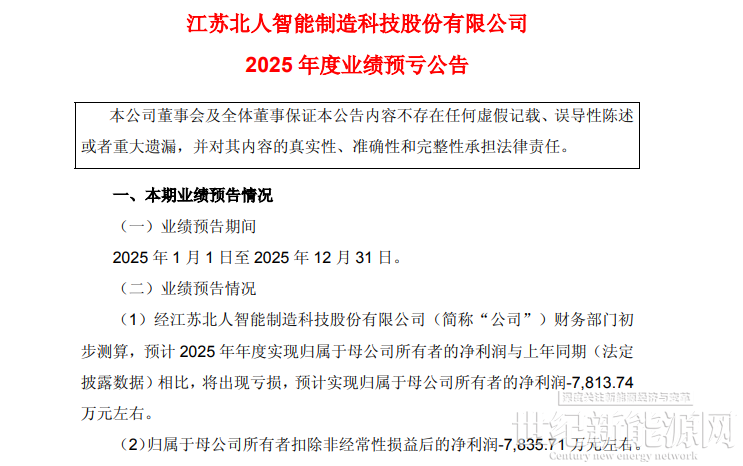 1月29日,江苏北人发布2025年度业绩预亏公告,预计全年归母净利润亏损7813.74万元,较上年同期盈利4519.84万大幅下滑,业绩“由盈转亏”。
