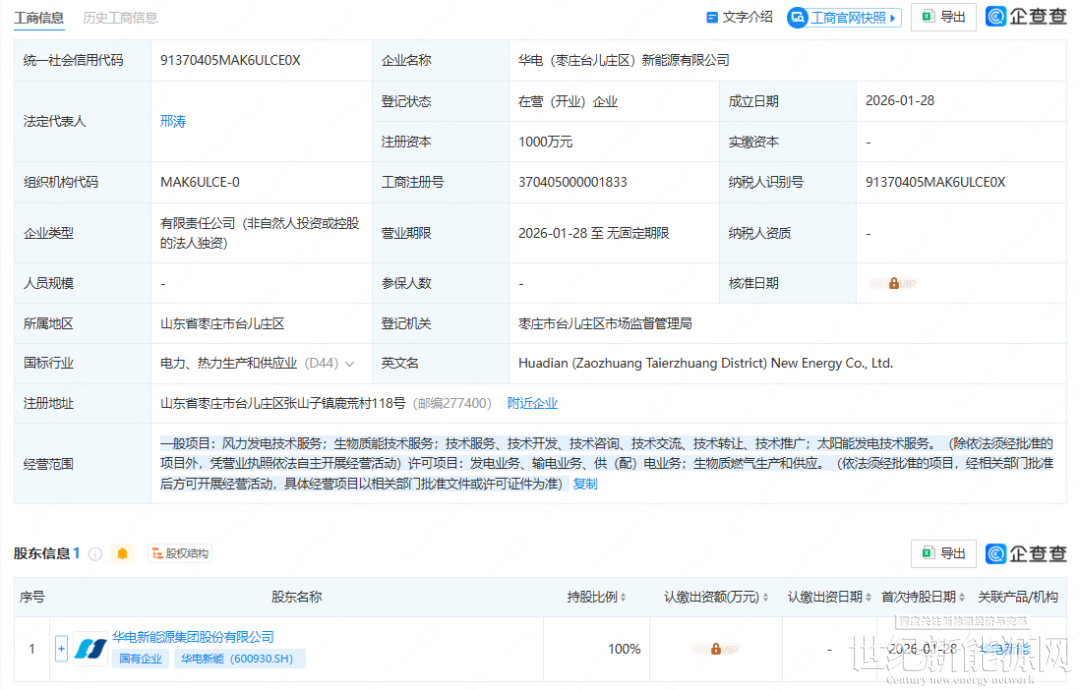 1月28日,华电(枣庄台儿庄区)新能源有限公司成立,注册资本1000万元,由华电新能源集团股份有限公司100%持股。