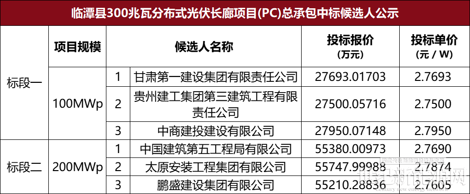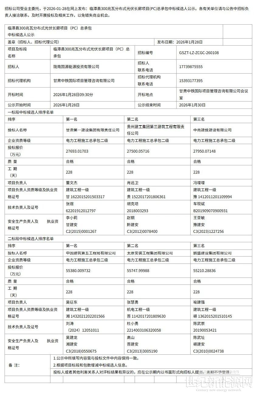 1月28日,临潭县300兆瓦分布式光伏长廊项目(PC)总承包中标候选人公示,招标单位为陇南国源能源投资有限公司。中标候选人如下: