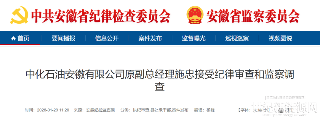 氢能观察获悉:中化石油安徽有限公司原副总经理施忠涉嫌严重违纪违法,目前正接受中央纪委国家监委驻中国中化控股有限责任公司纪检监察组纪律审查和安徽省芜湖市湾沚区监察委员会监察调查。
