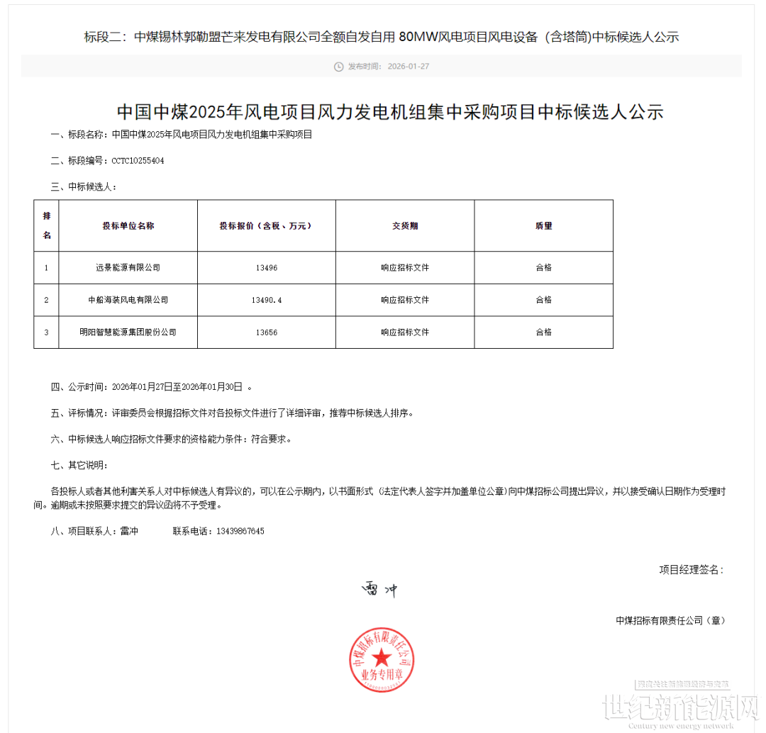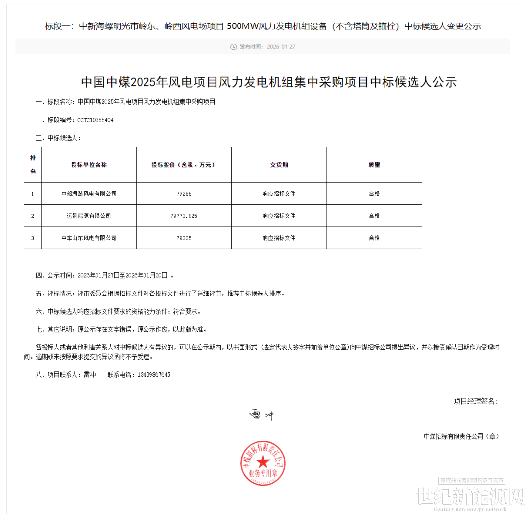 1月27日,中国中煤2025年风电项目风力发电机组集中采购项目中标候选人公示。公示显示,中船海装预中标标段一中新海螺明光市岭东、岭西风电场项目500MW风电机组设备采购项目,远景能源预中标标段二中煤锡林郭勒盟芒来发电有限公司全额自发自用80MW风电项目。项目不含塔筒投标单价在1586元/kW至1595元/kW之间,含塔筒投标单价在1686元/kW至1707元/kW之间。