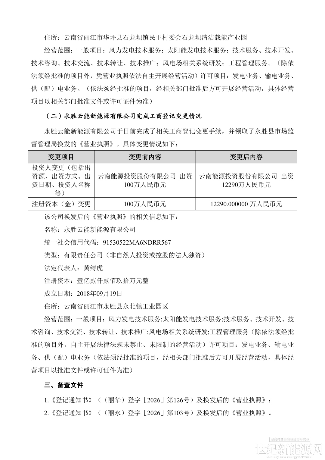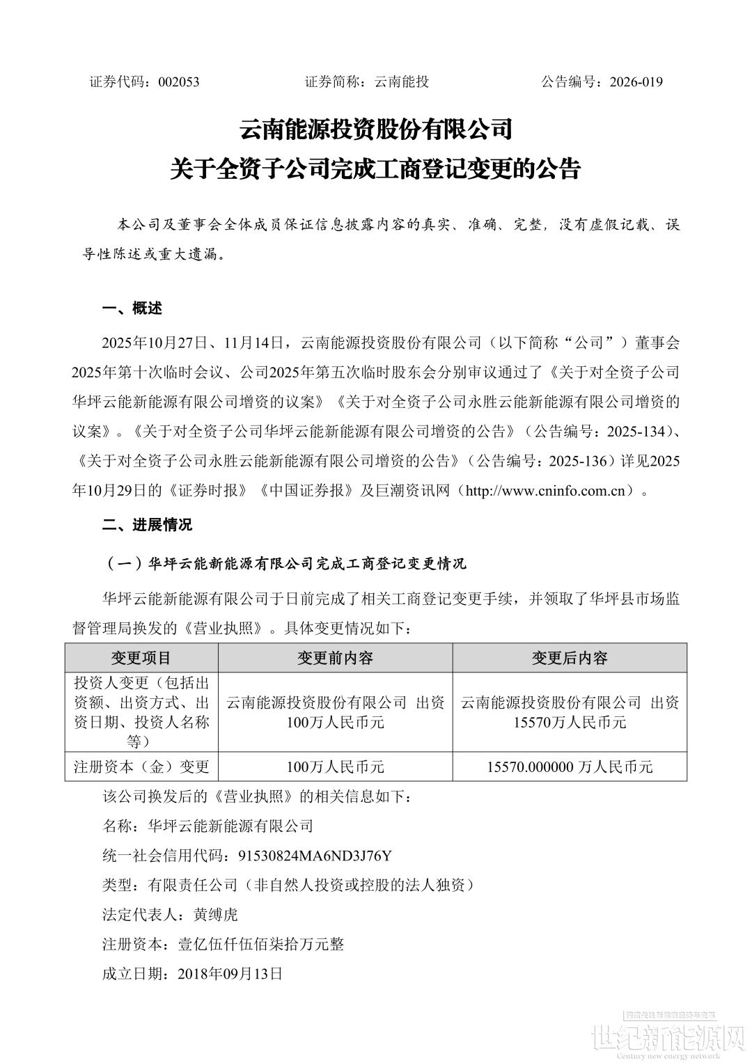 公告显示,华坪云能注册资本由 100 万元增至 1.557 亿元,投资人变更为云南能源投资股份有限公司出资 1.557 亿元;永胜云能注册资本由 100 万元增至 1.229 亿元,投资人变更为云南能源投资股份有限公司出资 1.229 亿元。两家子公司的经营范围均涵盖风力发电、太阳能发电技术服务及发电业务等。