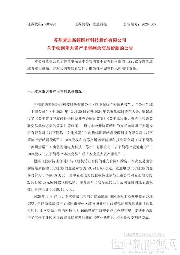 1月27日,麦迪科技(603990)发布公告,宣布已收到重大资产出售的全部剩余交易价款。这意味着,这家曾跨界光伏的上市公司正式完成了对其核心光伏资产——拥有9GW N型TOPCon电池产能的绵阳炘皓新能源科技有限公司的剥离。接盘方为绵阳市安州区国资委控制的安建投资,标志着该TOPCon电池企业正式由国资接手。