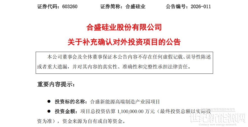 1月30日,合盛硅业(603260.SH)补充确认了一起对外投资项目。项目名称为合盛新能源高端制造产业园,定位于碳化硅全产业链,总投资规模110亿元。